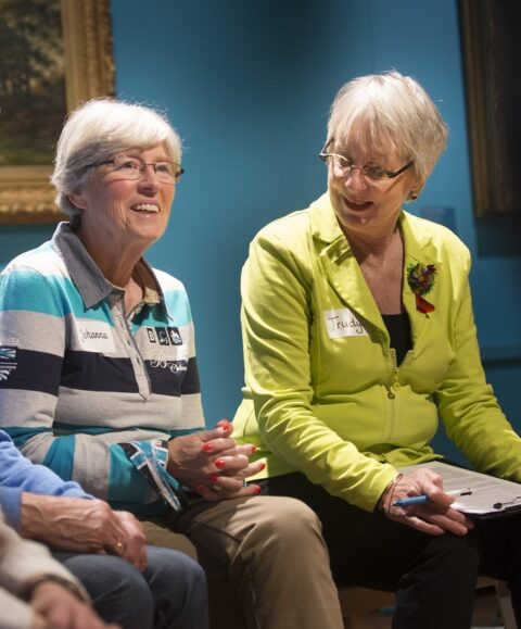 Mensen met dementie en hun mantelzorgers gaan in een ontspannen sfeer met elkaar in gesprek over wat ze zien.