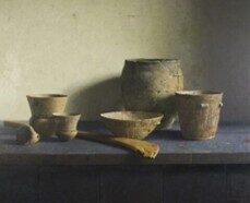 A beautiful artwork by Henk Helmantel is on display in the Zaal van de Verwondering at Labyrinthia. It is a still life. He paints them often. First, he places all kinds of everyday objects and then starts moving them around until he's happy with how they look. Did you know that Henk drew a lot as a child and that he sometimes moves things around for hours before he starts sketching?