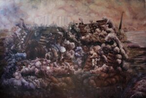 Atousa Bandeh’s History as a Poem features large, richly coloured paintings. Everyday objects often circle around young girls, who look you straight in the eyes. In several videos and a film Atousa Bandeh reports on a journey to or an attempt to buy land in her native country. Her most recent paintings, in a large format, no longer include people, but rather collapsing buildings, construction cranes or other objects. At the root of all these works are Atousa Bandeh’s personal experiences. In addition to memories, fears, loss of identity and poetry play a major role in her art.