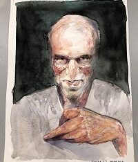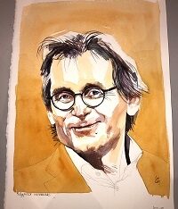 Siegfried Woldhek, Frank Westerman, 2016, aquarel, 28 x 24 cm, collectie Drents Museum - aangekocht dankzij steun Stichting Vrienden Drents Museum
