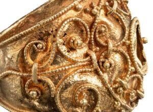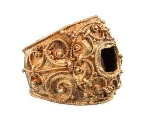 Wij zijn verheugd dat wij, samen met Het Drentse Landschap zo’n belangrijke vondst voor Drenthe behouden. Dankzij de toevoeging aan de collectie is de ring straks voor een groot publiek te bewonderen. De ring is 2,6 bij 2,3 cm groot en heeft daarmee een fors formaat. Midden op de ring is nu een gat te zien, daar zat een roze/rode steen gevat die los bij de ring is gevonden. De voorkant van de ring wordt daarnaast gekenmerkt door een zogeheten filigreinversiering: een uit bolletjes bestaande draad die in sierlijke ronde vormen over het oppervlak van de ring is gesoldeerd. Die versiering is op sommige punten met gouden nietjes verder bevestigd. De steen die in het midden van de ring heeft gezeten, heeft afgeschuinde zijkanten. Het betreft waarschijnlijk een granaatsteen. De ring is een absoluut topstuk binnen het scala aan bekende middeleeuwse sieraden.