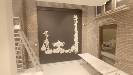 Na maanden van voorbereidingen in Smits atelier wordt het wandreliëf vandaag, woensdag 27 januari, geplaatst. Het is een keramisch 'danse macabre': skeletten dansen in een tutu met allerlei dierenvrienden om zich heen. Wat ook zeker opvalt is de smakelijke terrine die te zien is in het spektakel. Hiermee wil de kunstenaar met een dikke knipoog de bezoekers verleiden om een hapje te gaan eten in Pingo. Het werk draagt de naam Hond uit de pot ...