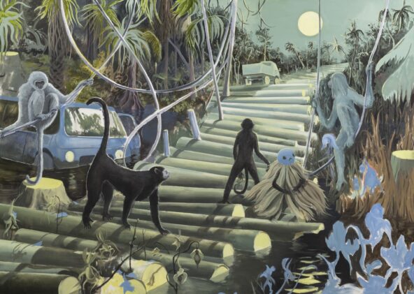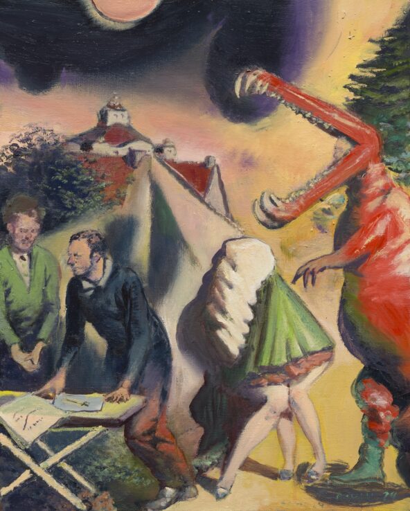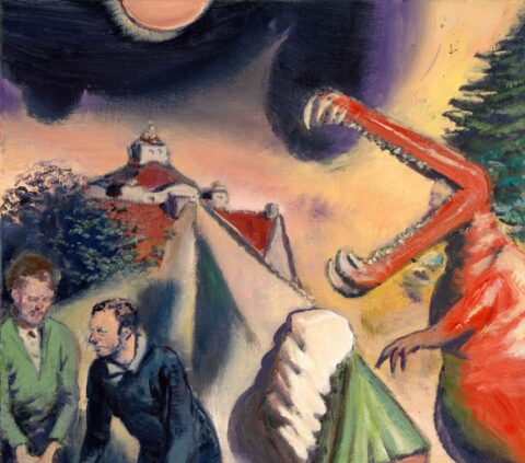 Neo Rauch, Das Dreibein, 2024, olieverf op doek, 50 × 40 cm, Collectie Drents Museum (aankoop met steun van de NAM), © c/o Pictoright Amsterdam 2025.