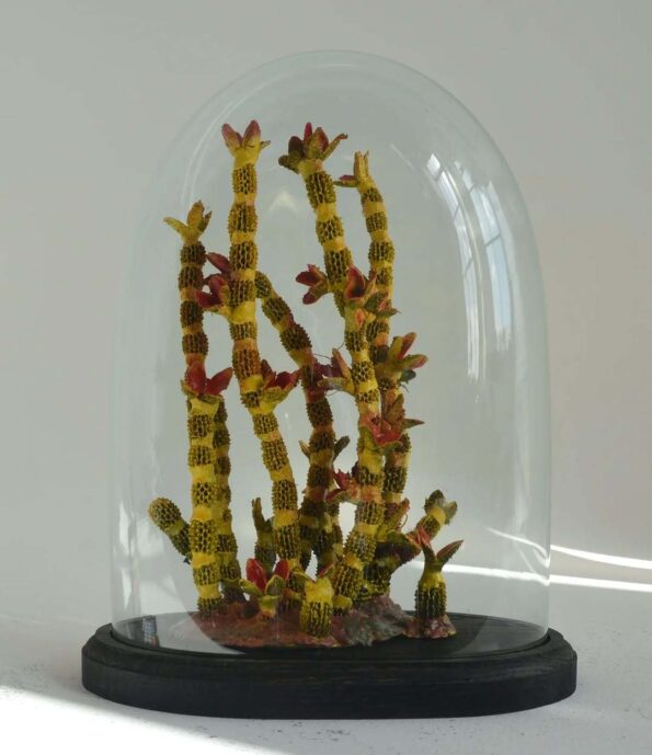 Dit kunstwerk komt uit een serie ‘koralen’ die eruitzien alsof ze net van de zeebodem zijn gehaald. Ze staan veilig onder glazen stolpen, maar wie goed kijkt, ontdekt dat deze koralen niet uit de natuur komen, maar zorgvuldig met de hand zijn gemaakt. Het past prachtig bij onze traditie van verzamelen vanuit nieuwsgierigheid en verwondering.