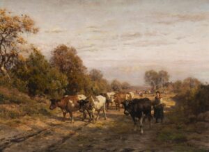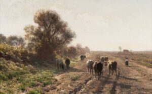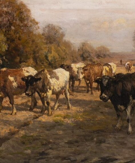 Julius Jacobus van de Sande Bakhuyzen (1835-1925), Drents landschap met koeien en boerin, datering onbekend, olieverf op doek. Schenking van JanHasker en Betty Jonkman