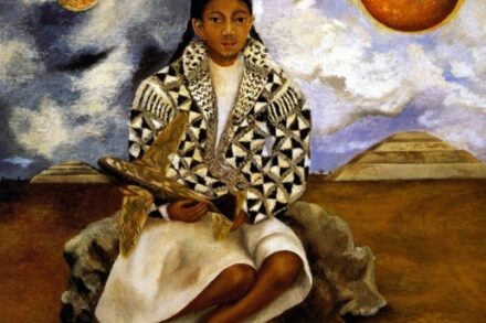Misschien is het interessant om ook haar andere schilderijen met een zon en een man eens in dit licht te bekijken. Frida’s schilderde geen mannelijke helden zoals de grote, mannelijke kunstenaars zoals haar man Diego Rivera destijds deden. Frida schilderde meestal vrouwen en in dit geval was het een meisje, waarschijnlijk Lucha Maria. Een dochter van mensen die werkten in haar huis. Het was een jong, eenvoudig, Inheems meisje. Ze zit voor de Pyramides van de zon en de maan. Dat meisje heeft een model vliegtuigje vast, dat verwijst naar jeugd en toekomst. In die tijd was een vliegtuig heel modern. In 19… wat is het? In 1930 heeft ze het geschilderd denk ik? 42, Ietjes later, sorry. Maar goed, toen was het nog steeds heel modern, een vliegtuig. Onze podcast heet ‘Op Frida’s Vleugels’ en in dit werk geeft Frida als het ware de vleugels aan een jong, Inheems meisje waarmee ze iegnlijk zegt dat zij de toekomst van Mexico in haar handen heeft. Als jij dus vraagt van; ‘Maakt Frida bruggen?’ Ja, ze slaat een brug vanuit dat Inheemse, vanuit de Azteken, naar de wereld. Je ziet dan dit meisje, dit meisje leeft nu. Tenminste, in haar nu. In de jaren 40 van de vorige eeuw. Dus het is in die tijd een modern meisje voor een hele oude geschiedenis met de toekomst, dat vliegtuigje, in haar handen.
