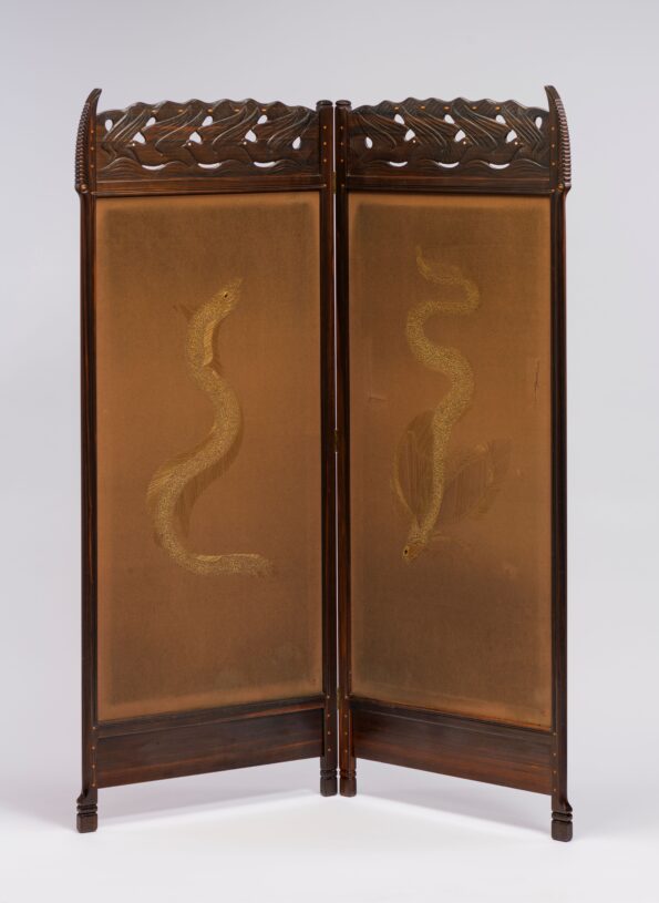 ◼️ Christine van Zeegen (uitvoering naaldwerk), Janus van Zeegen (ontwerp naaldwerk), Jacob van den Bosch (ontwerp kamerscherm), ’t Binnenhuis, Amsterdam (uitvoering kamerscherm), Kamerscherm met aalvis en vliegende vis, 1919, Collectie Drents Museum, langdurig bruikleen Collectie Meentwijck, erven D.J. Nienhuis