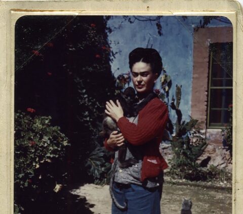 Fotograaf onbekend, Frida met een aapje, 1943, foto, 8,7 x 6,1 cm, Museo Dolores Olmedo, Xochimilco, Mexico / © Archive of the Dolores Olmedo Museum