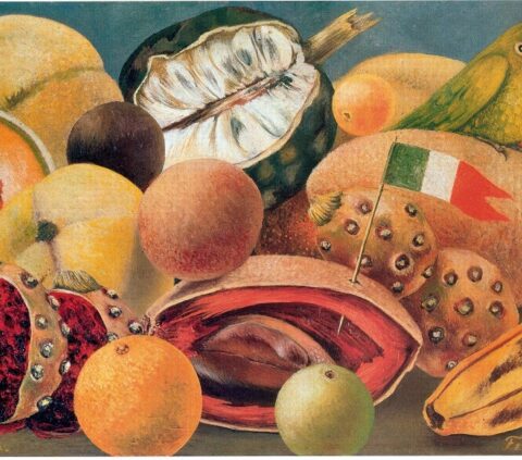Frida Kahlo (1907-1954), Stilleven met papegaai en vlag, 1951, olieverf op masoniet, 28 x 40 cm, Courtesy of Galería Arvil © 2021 Banco de México Diego Rivera & Frida Kahlo Museums Trust, Mexico Stad/ reproductie toegestaan door het Instituto Nacional de Bellas Artes y Literatura, 2021